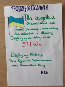 W ramach pomocy osobom narodowości ukraińskiej, przebywającym na terenie naszego regionu, zorganizowano zbiórkę dobrowolnych datków od młodzieży oraz pracowników bursy. Zebrana kwota 570 zł przekazana będzie na pomoc najbardziej potrzebującym. Cześć kwoty została przeznaczona na zakup artykułów medycznych dla podopiecznej PCPRu.